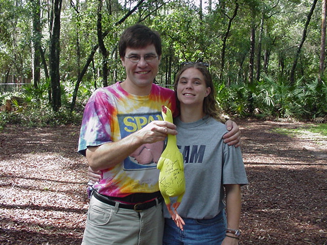 Justin's good friend Rachel and Hans's beloved Aunt Judy pose with the chicken.