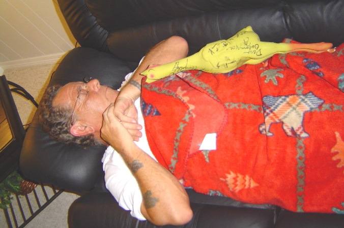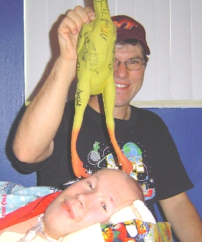 Hans introduces Justin to his new Minnesota Vikings rubber chicken.