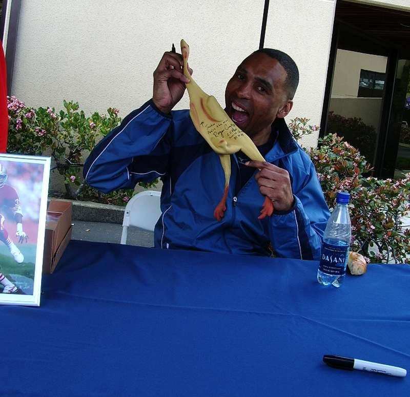 Roger Craig having fun, or a meal, depending on how you look at it. Do rubber chickens have a lot of protein, or carbs?