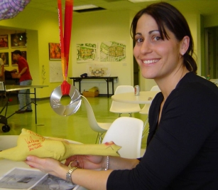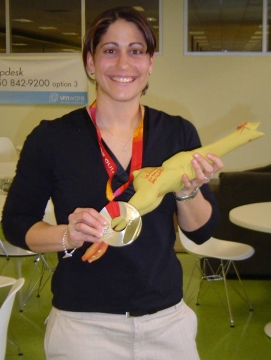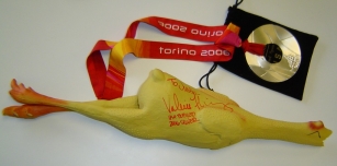 Olympic Bobsled Silvermedalist Valerie Fleming showing off the newly signed rubber chicken.