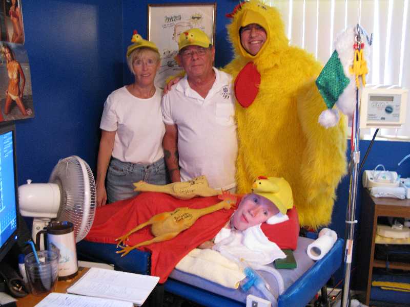 How bout the nut job in the Chicken Suit. Word is he ran the Death Valley 1/2 Marathon the weekend before coming to visit. Me thinks he did not get enough oxygen to that chicken brain of his. Fried Eggs, Fried Chicken Brains. Hans, a.k.a. "Chicken Man" knows how to keep my parents, uh, alert. |