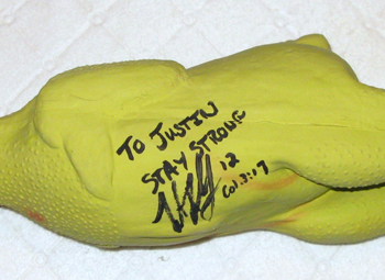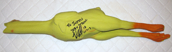 So Ben the CEO exterminator and country band drummer cleaned up my cockroaches and rode off into the sunset to get a rubber chicken signed by Super Bowl Winning Quarterback Trent Dilfer for my Muscular Dystrophy Association Summer Camp Camper Justin Sokolowski’s sports chicken collection. Say that five times real fast on one breath, and properly.